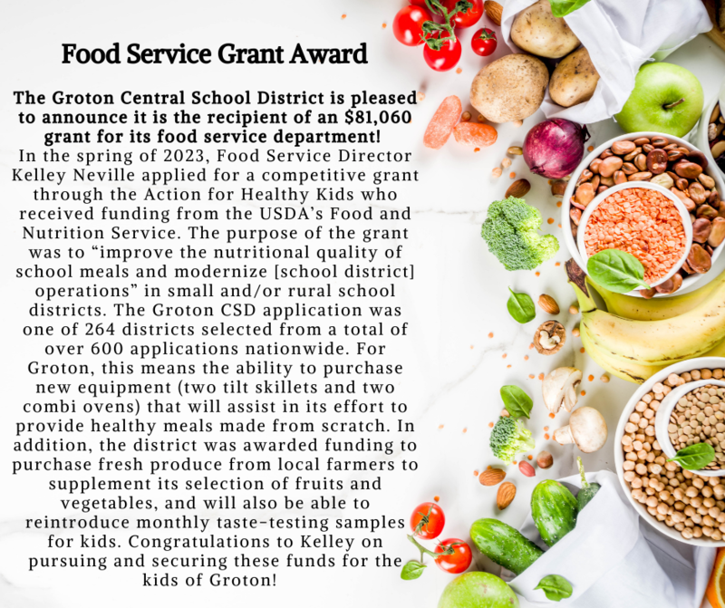 The Groton Central School District's Food Service Department is the recipient of an $81,060 grant!